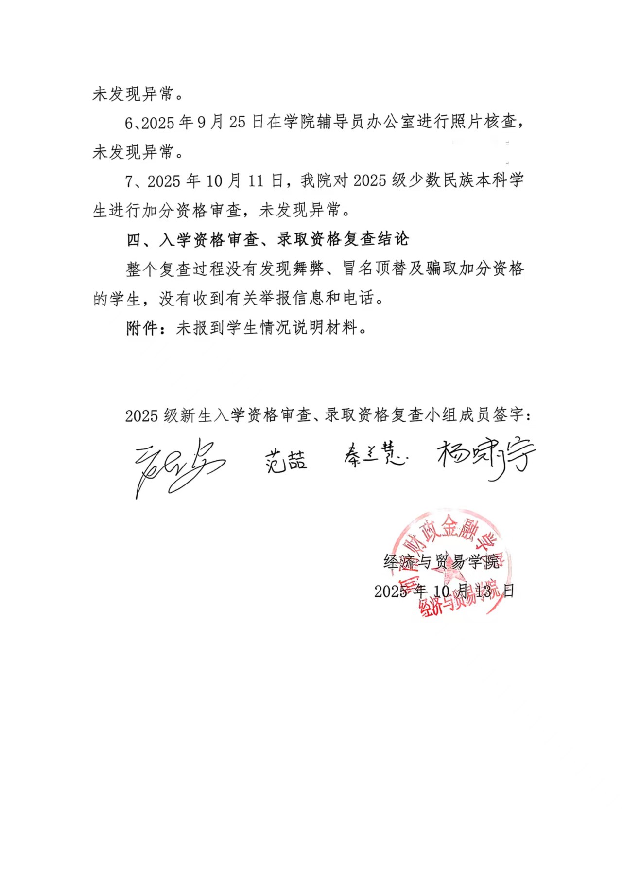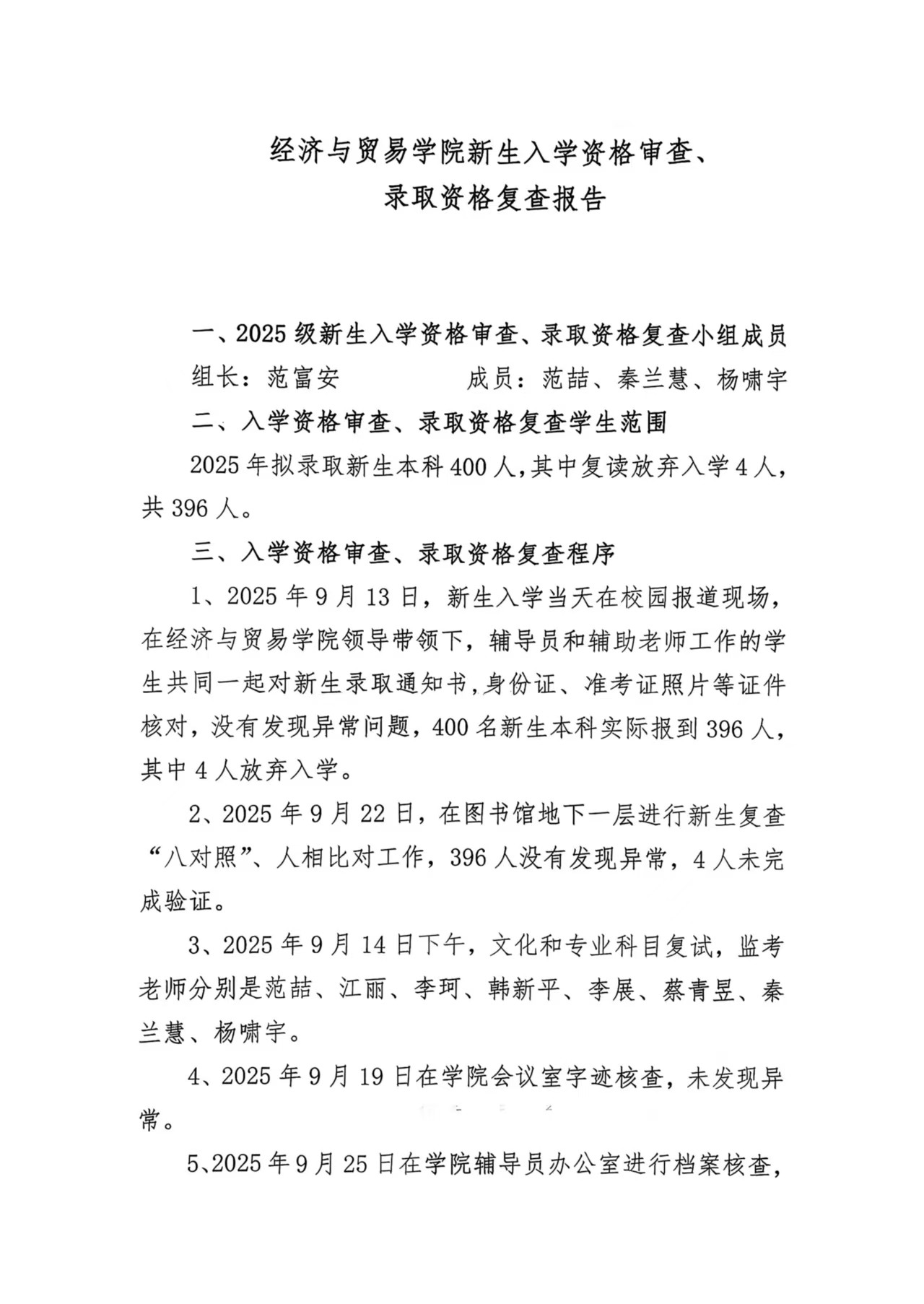 经济与贸易学院新生入学资格审查、录取资格复查报告